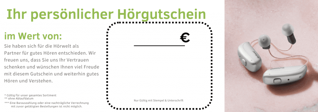 Gemeinsam mit uns können Sie ein neues Hörerlebnis ermöglichen. Bestellen Sie jetzt ganz einfach einen Hörgutschein – und sichern Sie sich zusätzlich 150 € Rabatt auf alle Akkusysteme.